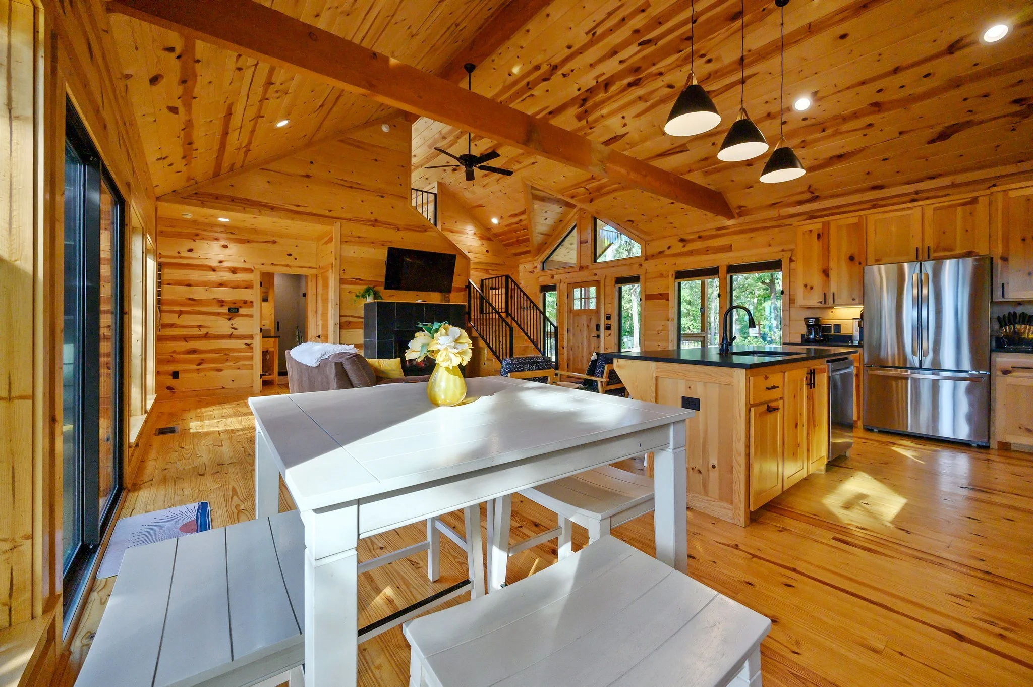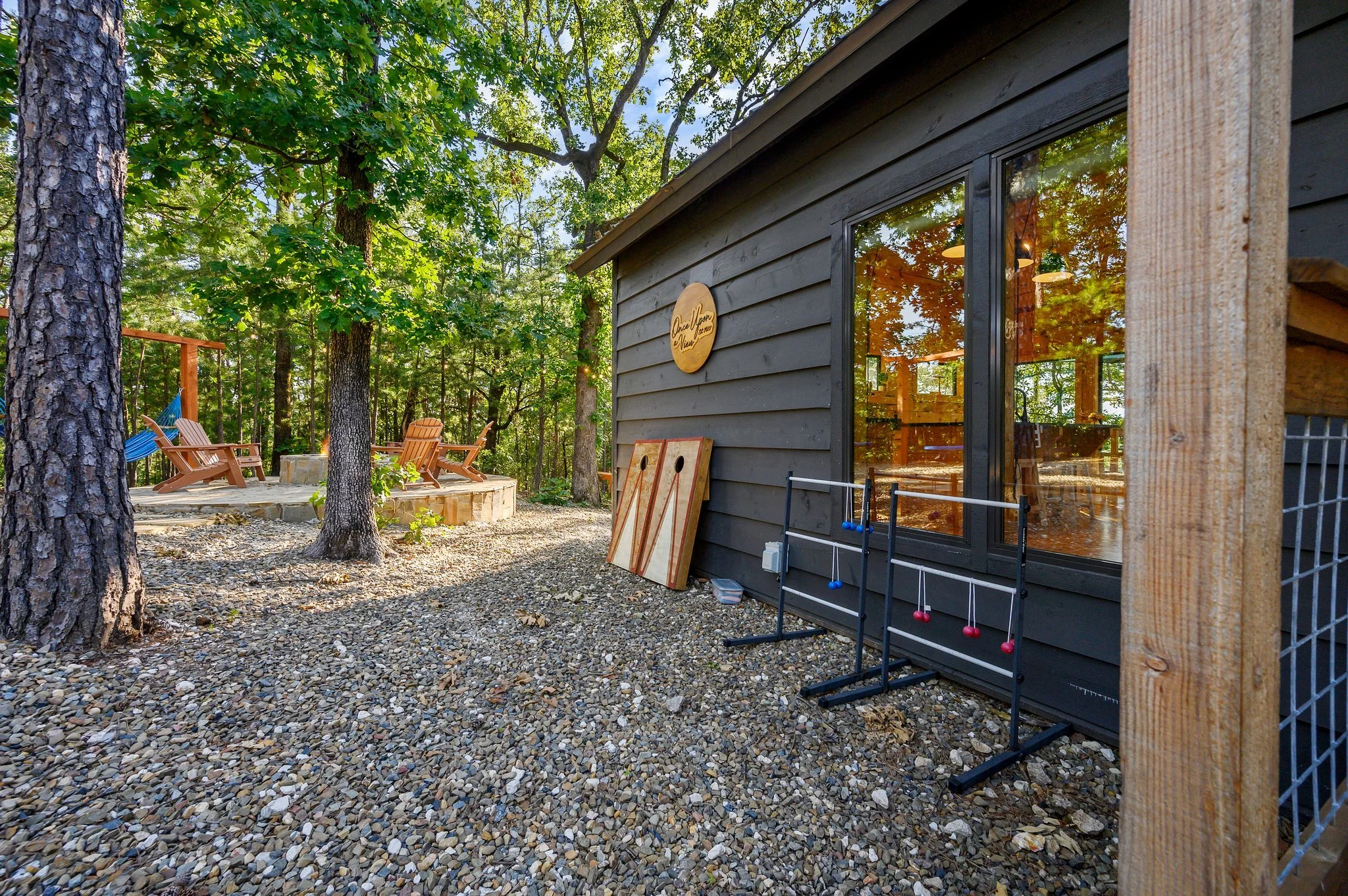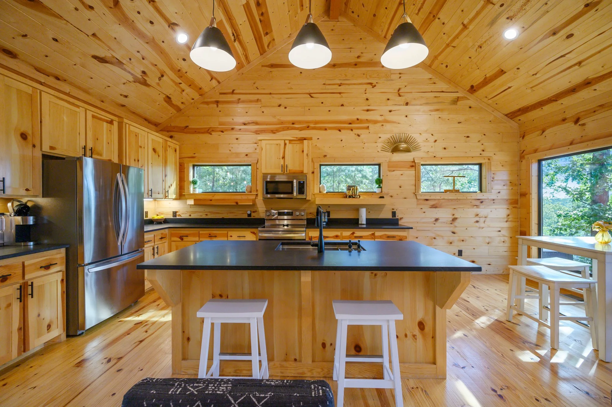 Little ones will love the adorable outdoor playhouse, while everyone can join in on a round of cornhole. You’ll also find a full-size washer/dryer, a private EV charger (by request), and even free kayak access for the lake nearby (signed waiver required for kayak and floating hammock).