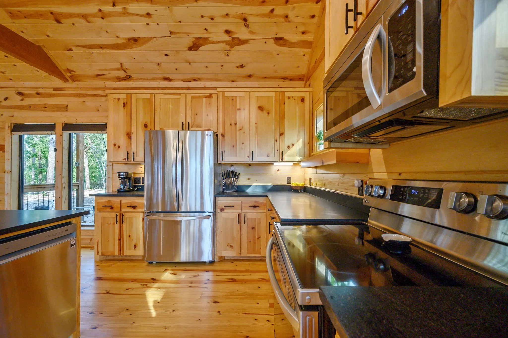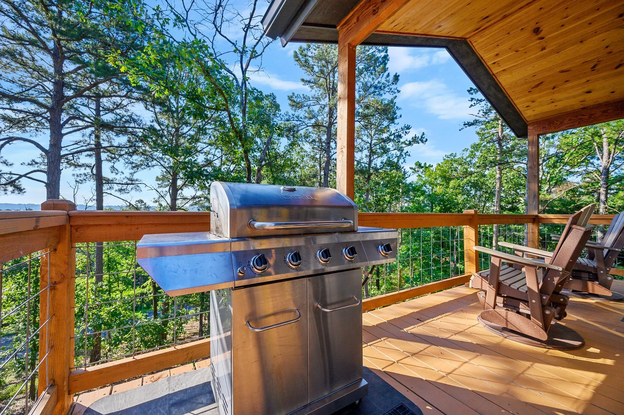 The open-concept living room and kitchen are perfect for together time, whether you're making pancakes or playing board games. A full-size pull-out bed adds extra sleeping space, and more sliding doors lead you to the best part: a sprawling deck designed for relaxing, grilling, dining, and soaking it all in!