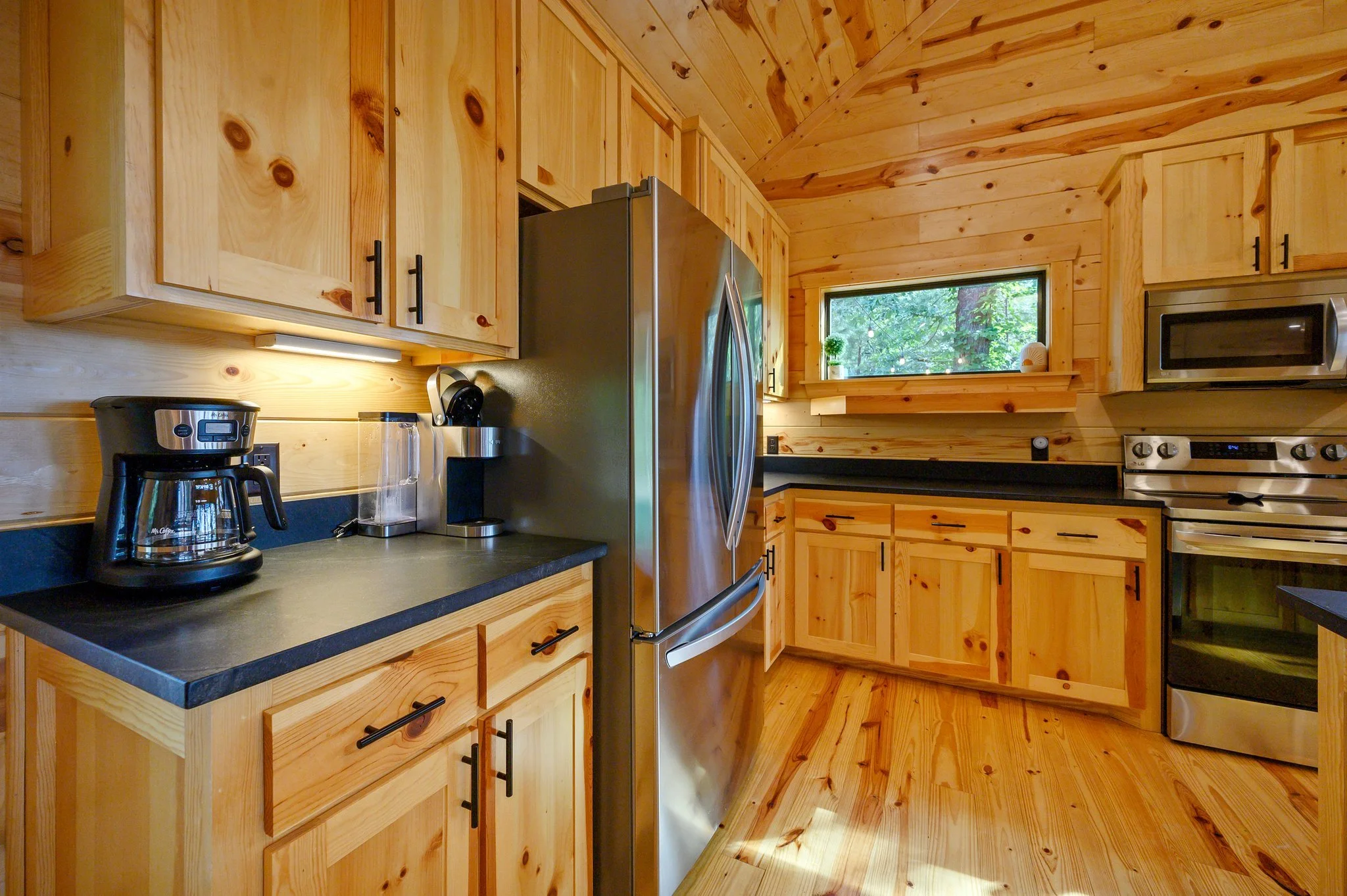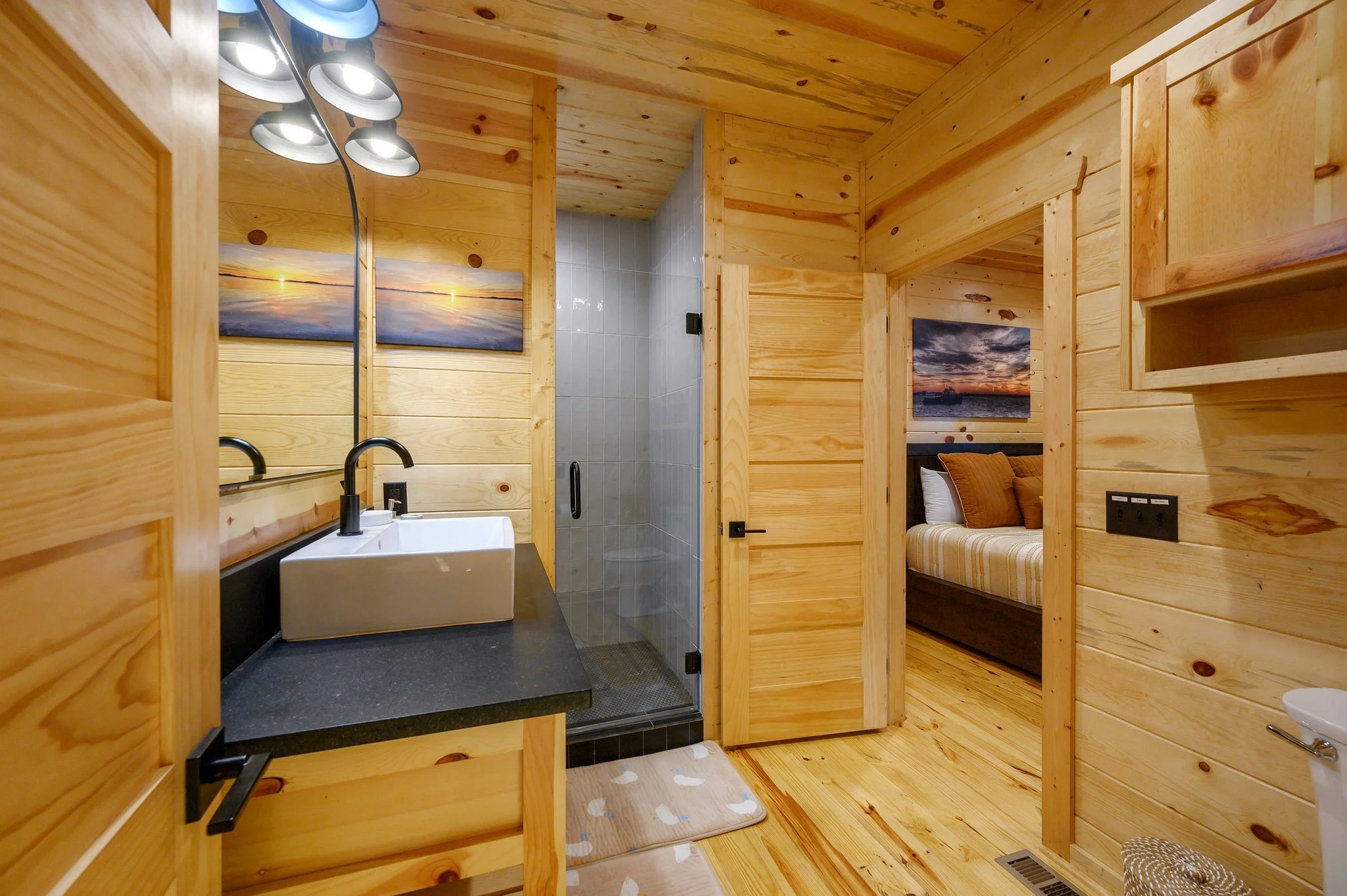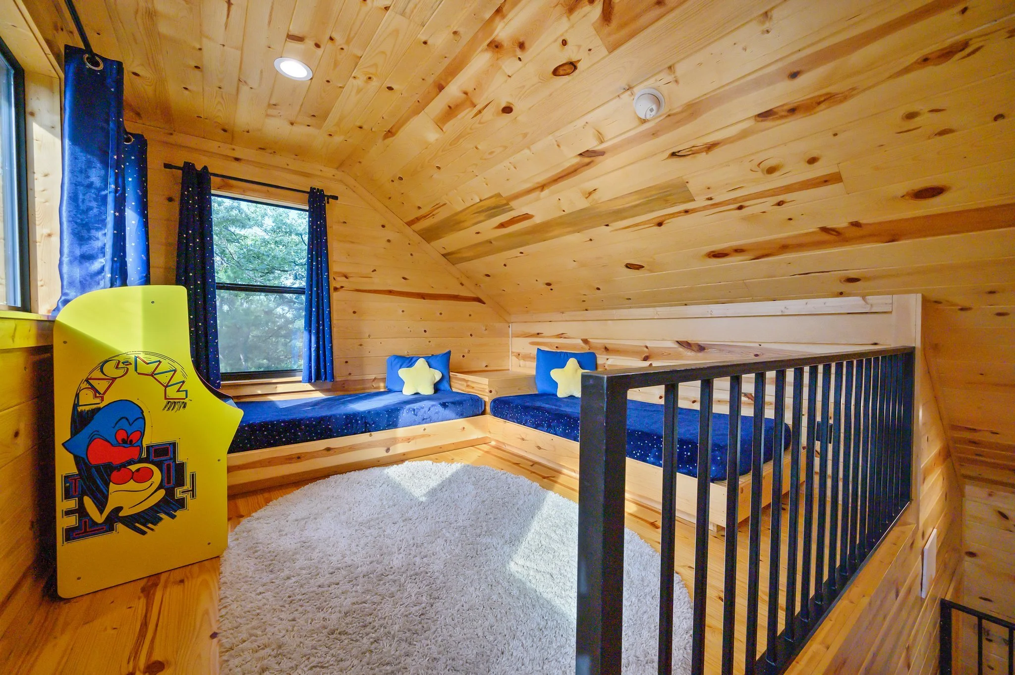 The second bedroom is just as inviting, featuring a queen bed, full bath, and another desk space for those mixing a little work with play. Upstairs, the loft is a total favorite! Two twin beds, a vintage Pac-Man arcade, and panoramic forest views that feel like your very own treetop hideaway.
